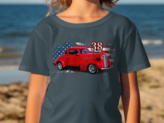 38 Chevy Classic Car with American Flag Youth T-Shirt