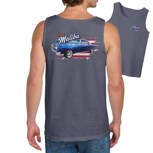 1965 Malibu Blue Flames American Flag Background mens Tank