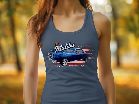 1965 Malibu Blue Flames American Flag Background Womens Tank